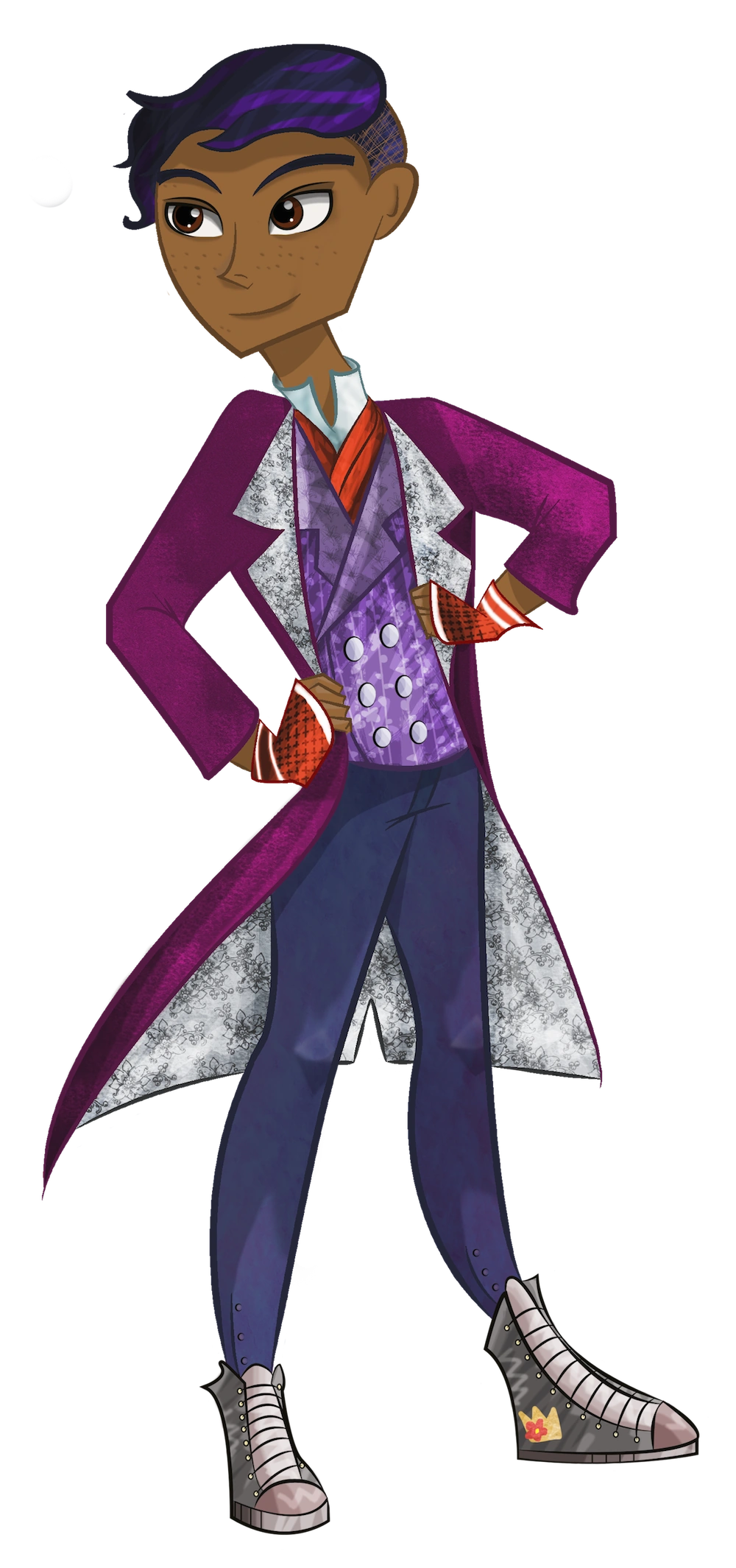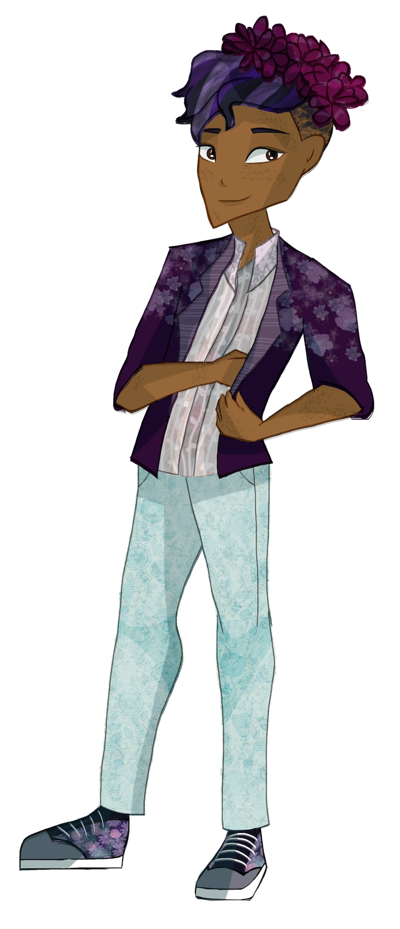 Hyacinth is black-Norwegian, with dark brown skin dotted with freckles. He is rather short and slim in statue compared to the other princes. He has rather rounded facial features which he tries to contour away with makeup, and wide, inquisitive brown eyes.